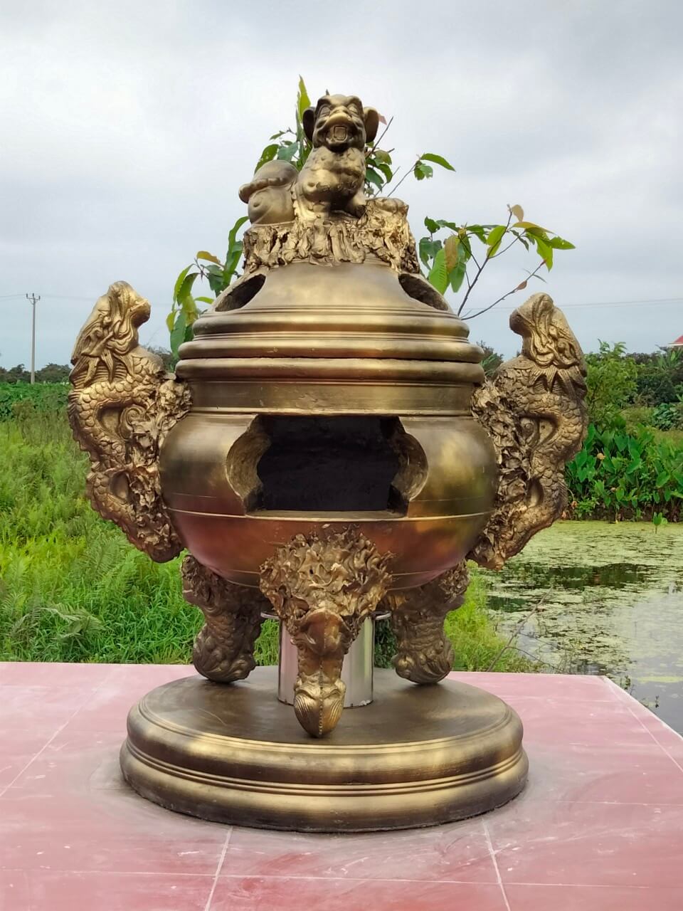 Thiết kế như đỉnh hóa vàng gia đình với bụng đình phình to bên cạnh có 2 chú rồng tôn lên vẻ đẹp cho đỉnh. 3 chân vững chãi chạm khắc long phụng thể hiện sức mạnh uy linh giao hòa giữa đất và trời, âm và dương cầu mong người cõ âm nhận được vật cúng từ người cõi dương và phủ hộ cho gia đình được bình an nhân khang việc thịnh. Miệng hóa vàng được thiết kế chuẩn lô ban: là nơi đưa vàng mã và các đồ dùng hàng mã vào để hóa.